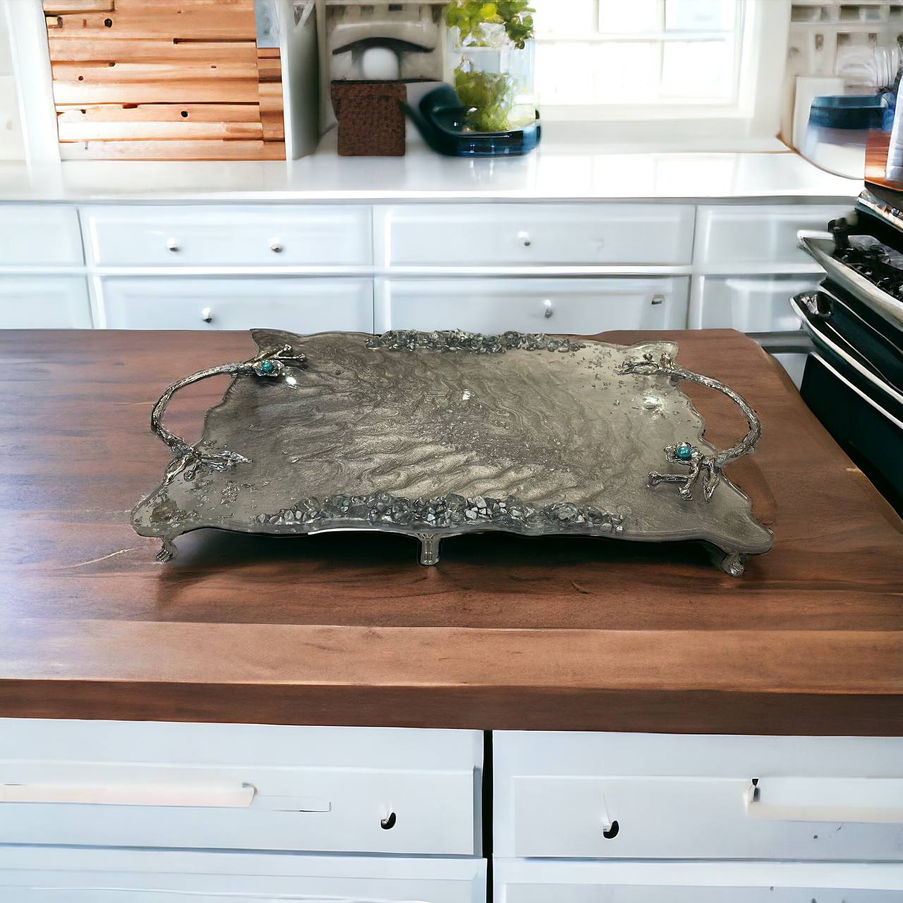 این سینی با استفاده از رزین کره ای استحکام بالایی داشته و قابل شستشو میباشد دسته ی این سینی در مرحله رزین ریزی جاگذاری شده و استحکام بالایی دارد این سینی با سنگ های تزئینی و پایه هایی زیبا ،چشم نوازی این محصول پر کاربرد را دو چندان کرده اسj.
